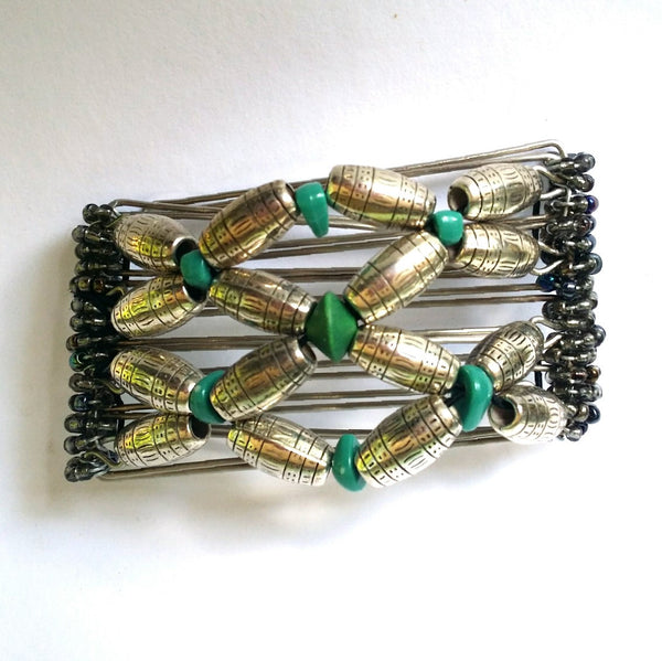 5 Tooth comb. Silver and turquoise color beads with clear smokey AB glass seed beads on comb spine. Regular length teeth. Good for all hair thickness.